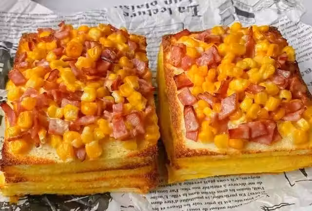 1、準備食材:吐司片、培根、玉米粒、沙拉醬、雞蛋、芝士片