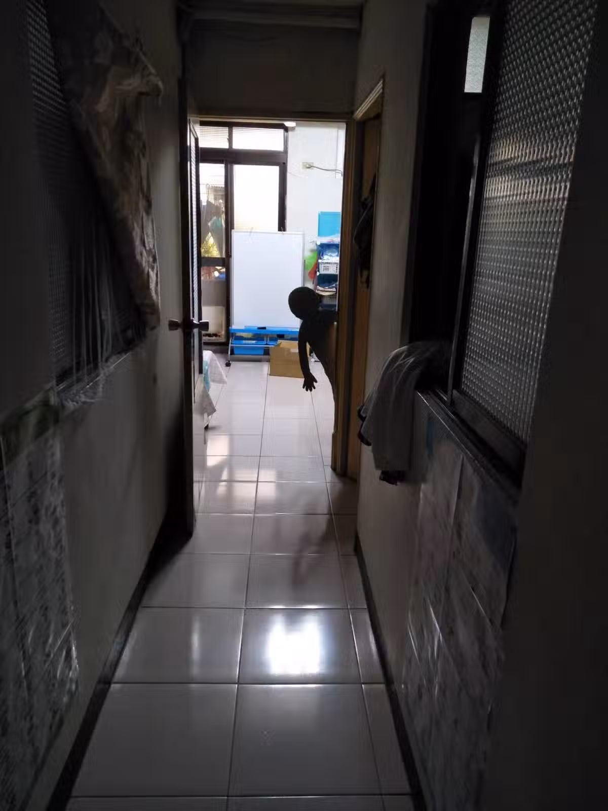 雖然內心感到很恐懼,但隨後原PO還是勇敢地走上前查看,這才發現所謂的鬼影其實是老婆依照小孩外型裁剪的「人形立牌」。 原PO補充說,平常老婆和小孩就經常玩畫腳印和手印的遊戲,剛好鄰居給了超大的冰箱紙箱,因此才會畫人形立牌來玩,「然後我就受驚了!」。