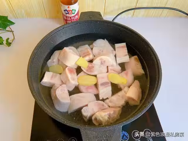 2.鍋中放清水,放入豬蹄,一勺料酒,幾片生薑,焯水後撈出,用溫水沖洗乾淨。