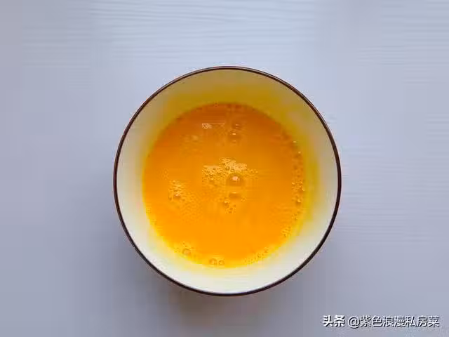 4.雞蛋打入碗中,放少許鹽,一勺料酒,打散,雞蛋中放料酒可以去蛋腥味,炒出來的雞蛋更香更蓬鬆。