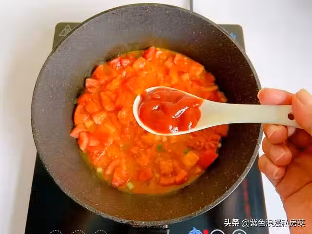 4.鍋中放橄欖油,放蔥花爆香,放番茄炒出番茄汁,放一勺番茄醬翻炒。