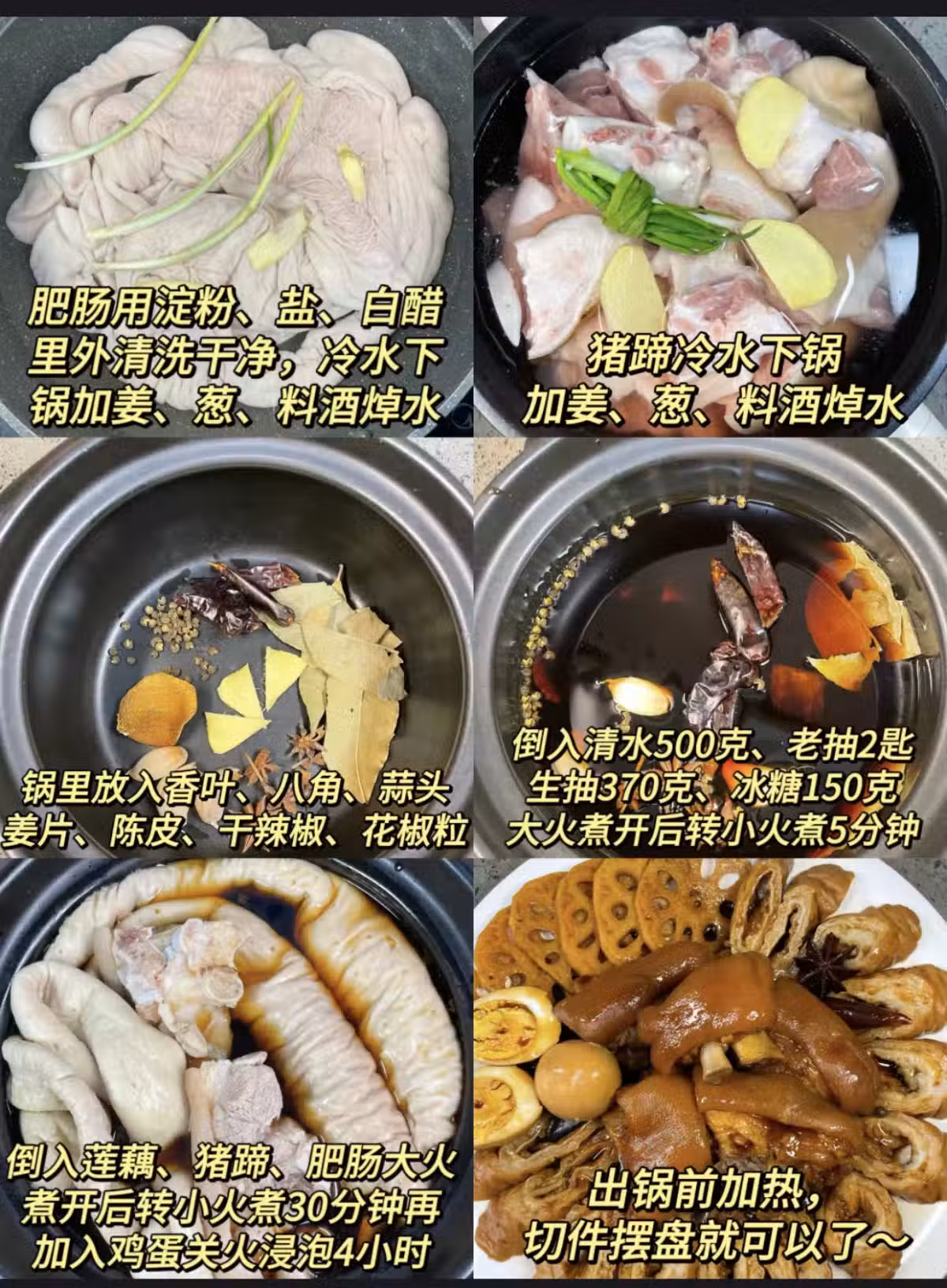 肥腸、豬蹄、蓮藕、雞蛋、香葉、八角、陳皮、干辣椒、花椒粒、冰糖