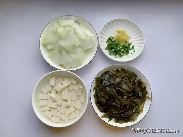 1.準備食材,冬瓜去皮切片,海帶提前泡發切小塊,生薑切絲,切蔥花。