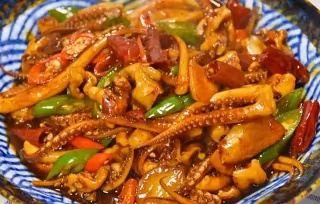 (5)最後再倒入調好的料汁,大火翻炒均勻,至食材熟透入味,大火收汁,關火出鍋,將魷魚盛入盤中,就可以開吃了!