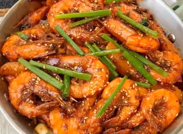 (9)大火收汁,關火出鍋盛入盤中,再撒上適量的熟芝麻,點綴一下,就可以開吃了,色香味美,好吃到根本停不下來,上桌就光碟,大蝦這樣做,大人小孩都愛吃!