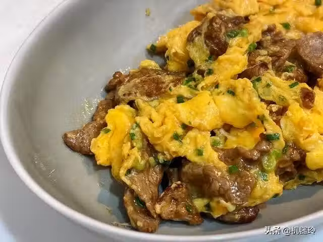 炒鍋燒熱關火,再倒入稍微多一點油,迅速倒入蛋液和煎過的牛肉片,利用鍋的餘溫滑蛋,滑蛋一旦定型就推開,如此反覆,注意不要翻炒。