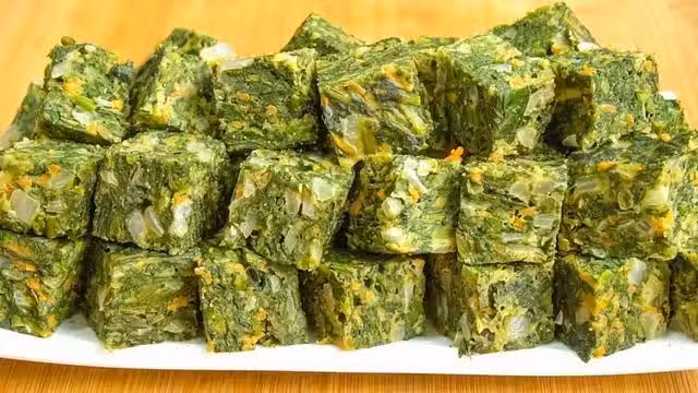 準備一個模具,底部刷一層薄薄油,將紅薯葉糊倒進來,稍微整理平整