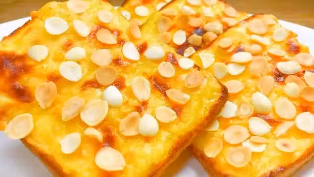 接下來調乳酪醬糖5克,低筋麵粉10克,牛奶80克,黃油7克,芝士2片,杏仁片適量,黃油融化後加入麵粉,攪拌至無乾粉,加入牛奶,糖,芝士片,放入鍋內攪拌加熱,熬煮成酸奶狀,塗抹在吐司上