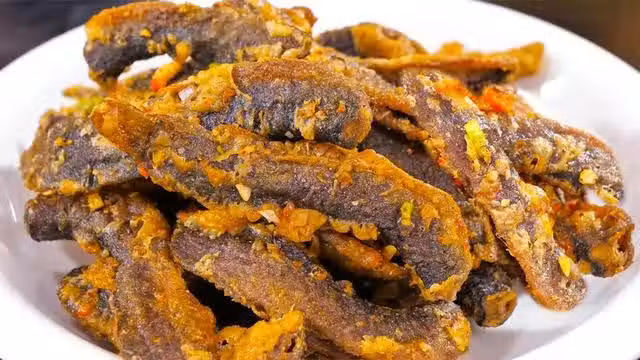 鍋中油溫燒至七成熱,下入泥鰍,復炸一分鐘,把泥鰍炸至表皮金黃酥脆,這樣吃起來更香,撈出控油