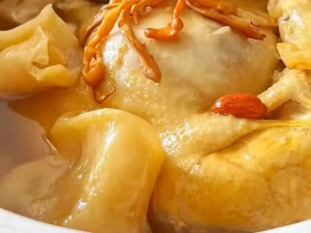 準備食材:花膠,雞肉,蟲草花,紅棗,枸杞子,薑片。