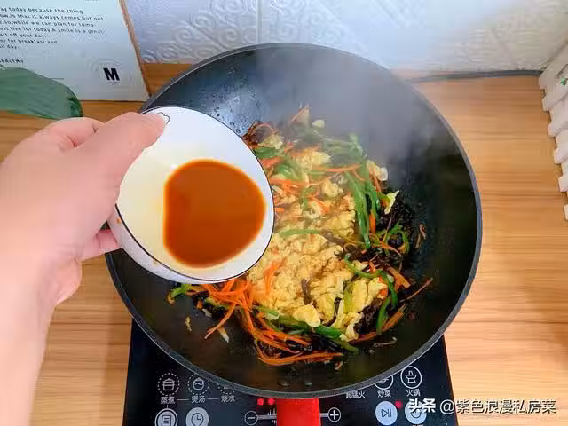 9.倒入炒好的雞蛋,淋入魚香汁翻炒。