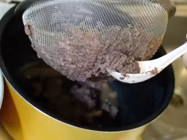 把紅豆放到篩子裡面去,然後用個勺子壓,下面就可以出來軟綿細膩的紅豆沙。建議不熟手的,一次不要倒太多,每次壓兩勺就差不多了。
