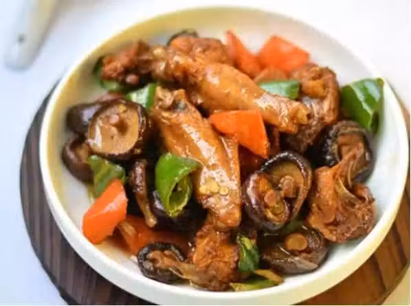3.加熱鍋中的油,加入生薑和大蒜直到香,倒入雞塊,炸至雞肉變色為生醬油,舊醬油和料酒直至變色。