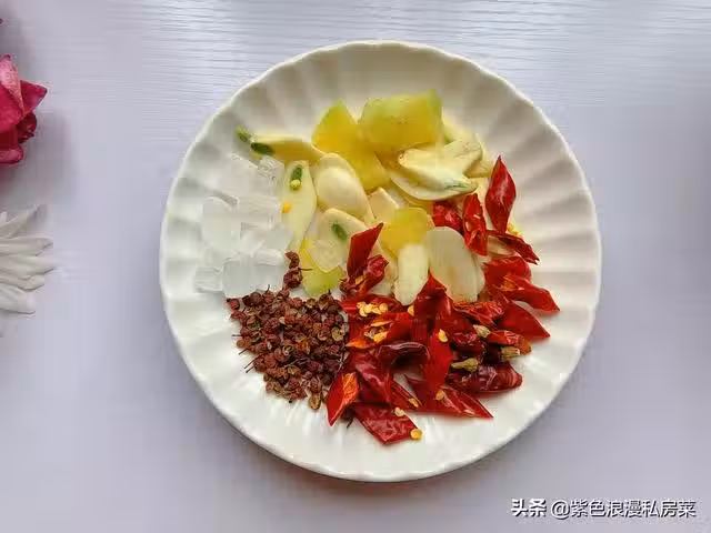 4.準備佐料,大蒜切片,生薑切片,干辣椒切碎。