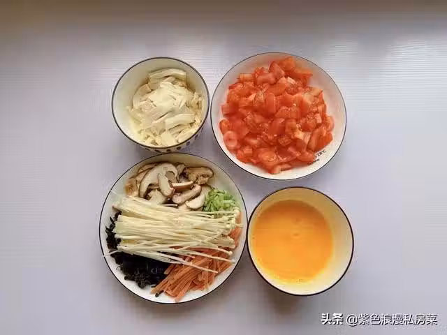 1.準備所有的食材,番茄去皮切丁,木耳提前泡發切絲,香菇切片,豆腐切絲,火腿腸切絲,雞蛋放一勺料酒打散備用。