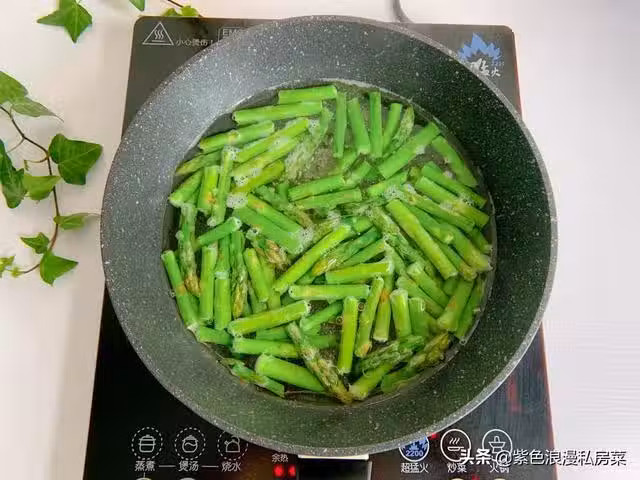 4.鍋中放清水,放一勺鹽,一勺食用油,水開後放蘆筍,焯水兩分鐘撈出。