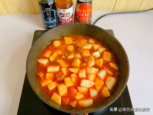 6.番茄燉化了,濃濃的湯汁,牛肉也燉軟爛了,放入蘿蔔,放適量的鹽,再小火燉20分鐘。