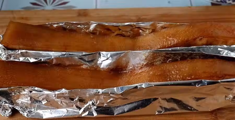五花肉烤出來的油都流進錫紙裡面了。烤好的肉色澤金黃誘人,香氣撲鼻,看著就流口水。