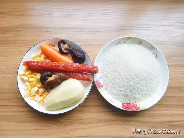 2.香腸切片,土豆 胡蘿蔔,香菇切丁。