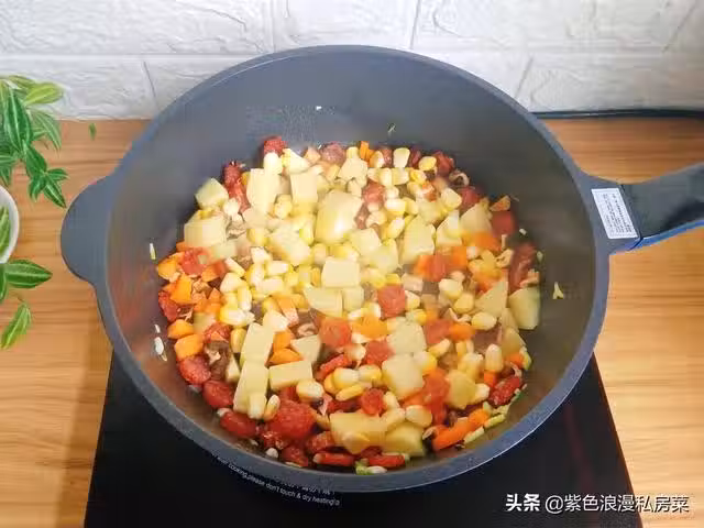 4.鍋中放油,放入香腸,小火煸炒出油,放玉米粒,胡蘿蔔,土豆,香菇翻炒。