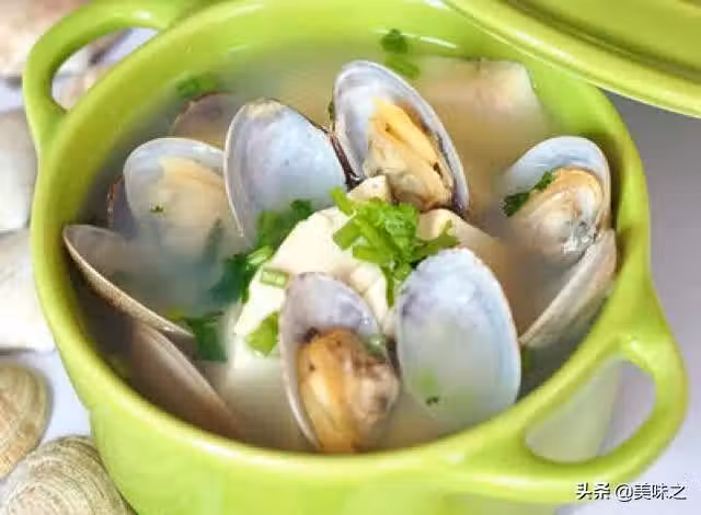 1、蛤蜊吐盡泥沙後洗凈,香菜切末,姜切細絲,豆腐切塊。