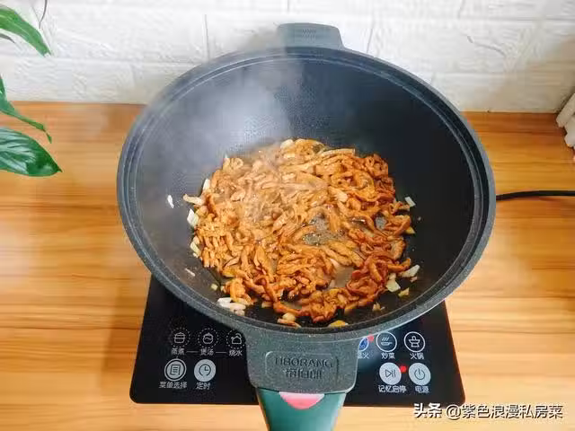 5.鍋中放油,放大蒜片爆香,放肉絲翻炒斷生。