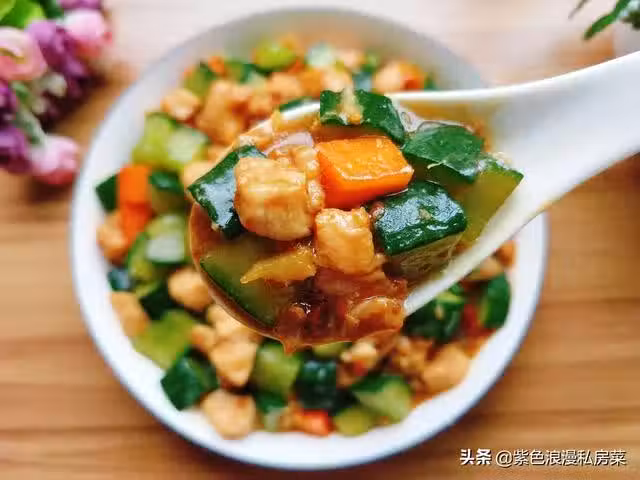 黃瓜一根,雞胸肉兩塊,胡蘿蔔一小段,干辣椒三個(不吃辣的可以不放),生薑一塊,料酒一勺,生抽一勺,老抽適量,蚝油一勺,食用油適量,食用鹽適量,胡椒粉雞精適量,香蔥一根。