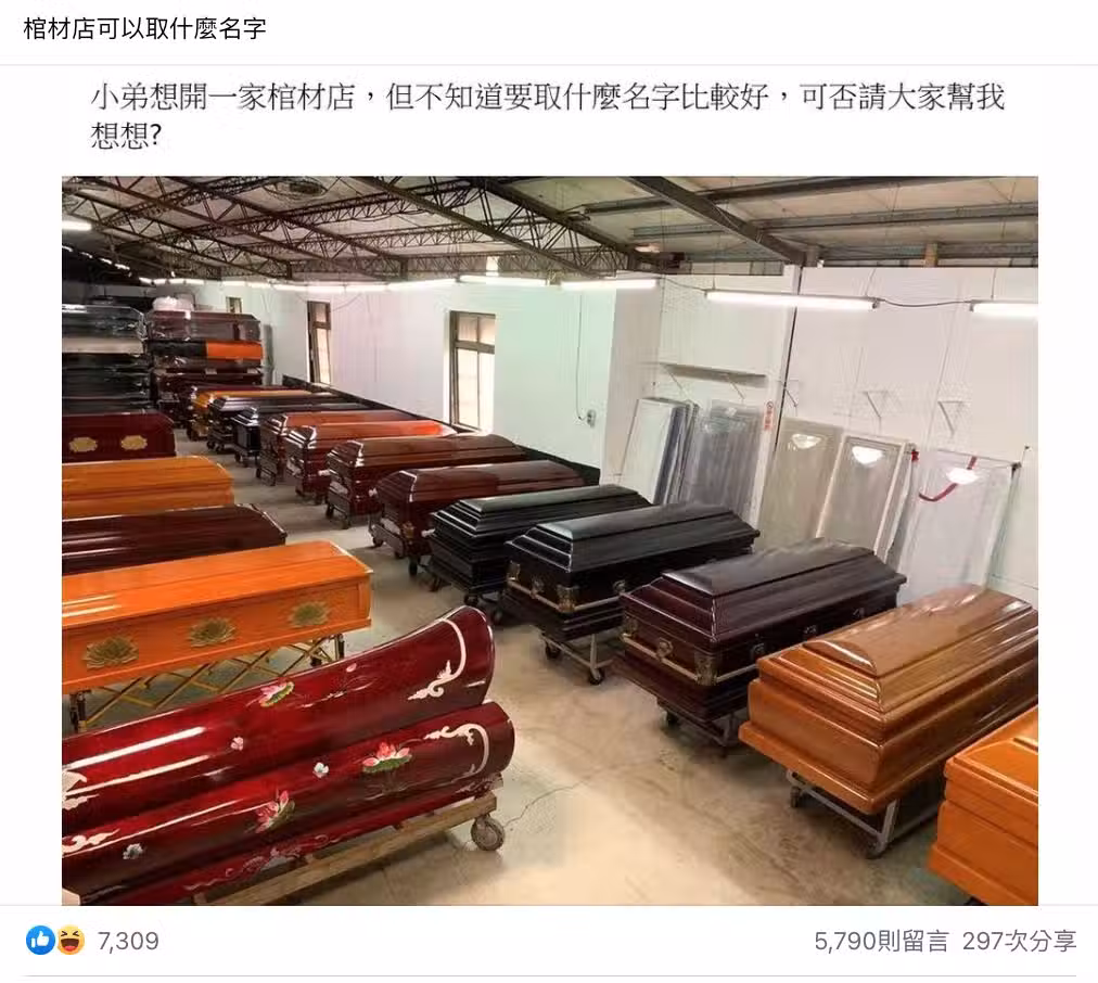臉書粉專「爆廢公社公開版」經常分享一些逗趣好笑的貼文,這次剛好遇到一位粉絲想要幫自家新開的棺材店想一個特別的名字,內容寫道「小弟想開一家棺材店」,因為服務性質特殊,無法用其他方式吸引顧客,因此想把腦筋動到取店名上面,發文問大家「不知道該取什麼名字好,想問問大家有沒有什麼想法?」
