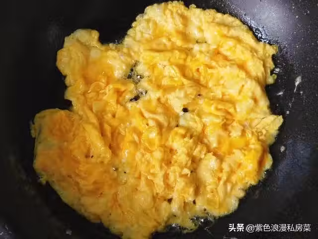 步驟四:鍋中放油,油溫七成熱的時候,倒入蛋液,並用筷子將雞蛋劃散,由於雞蛋裡面加了一勺清水,雞蛋變得很嫩很蓬鬆。雞蛋炒好以後盛出備用。