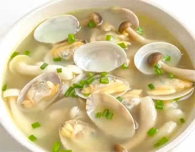 步驟二:鍋中燒油,把蔥花炒香,再把白玉菇下鍋炒軟,加入適量的開水,煮熟後放入花甲,全部熟透以後,加點鹽和蔥花即可。