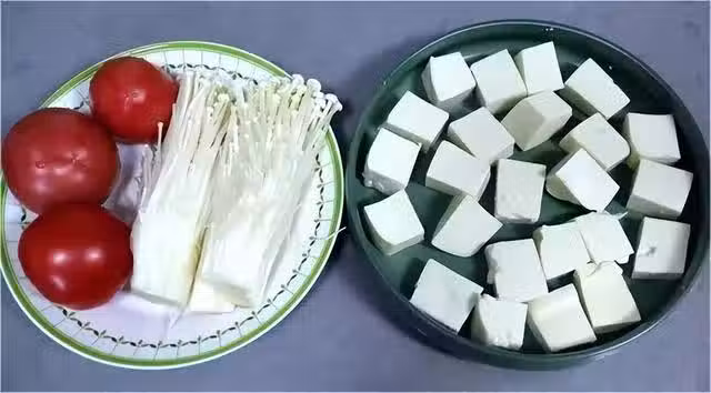 步驟二:鍋中燒點油,把番茄下鍋炒出湯汁,加鹽,出汁更快,加入適量的開水,煮開後再加入金針菇、豆腐塊,煮三分鐘,再把蛋液淋上去,加生抽、陳醋、胡椒粉、鹽調味,煮兩分鐘出鍋。