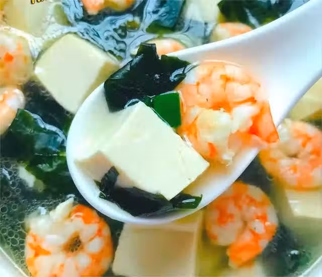 食材準備:裙帶菜,豆腐,大蝦,黑胡椒,鹽,料酒,枸杞,雞蛋等。
