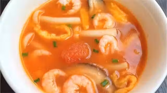 步驟四:鍋里放兩勺油,把蝦頭炒出紅油,撈出,這樣做出來的湯多了蝦的鮮味,再把西紅柿下鍋炒出汁,放入菌菇、蝦仁翻炒一分鐘,再加適量的開水,煮兩分鐘加入蛋皮絲、鹽、雞精、蔥花調味,即可出鍋。