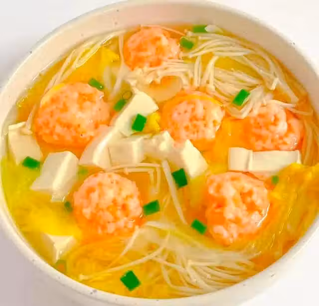 食材準備:大蝦,料酒,澱粉,蛋清,胡椒粉,金針菇,嫩豆腐,蔥花等。