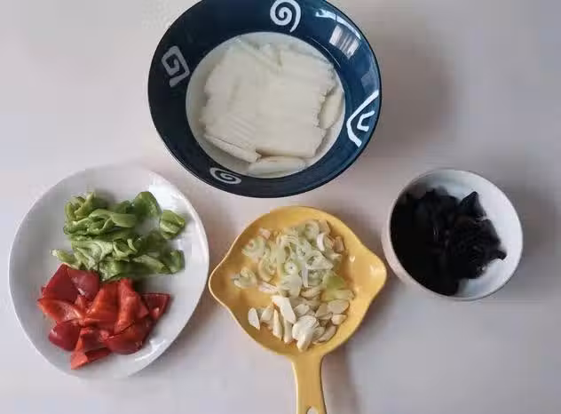 步驟2:取出青椒和紅椒的種子和莖,洗凈切成三角形,將大蒜去皮切成蒜末,將細香蔥切成段。