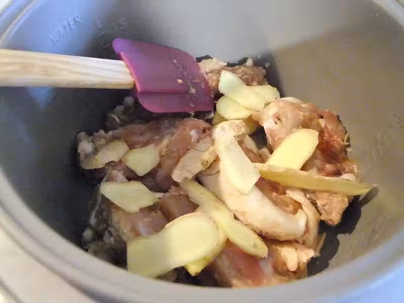3.電飯煲里加入半茶匙的麻油,加入切好的紅蔥煸炒至香味溢出,再把腌好的雞肉和薑片倒入,蓋好,啟動開煮。