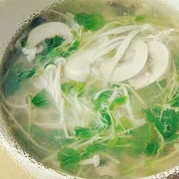 2、水開後加入金針菇,稍煮,加入豆苗。