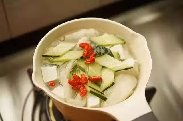 7、放入黃瓜片,枸杞再煮兩三分鐘,調入少許鹽提味即可。