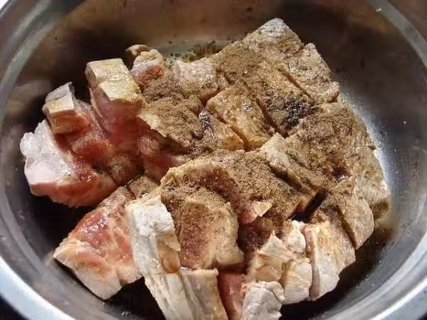 (6)加入五香粉、油、豉油、糖、鹽等調味料醃製4個小時以上,隔夜更入味。