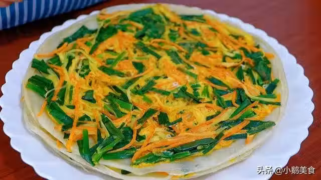 8、把餅子對摺起來吃,兩邊是餅,中間是餡,就像餡餅一樣,但做法更加簡單。餡料里加入生雞蛋超級鮮美,吃的時候不掉渣,餅皮柔軟勁道,餡料鮮香味美,吃起來非常不錯。