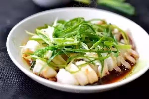 3. 將多餘的汁倒掉,薑絲也去除、然後重新在蒸好的魷魚上淋少許的海天淡口醬油,撒上適量香蔥絲,最後淋少許的熱油即可。