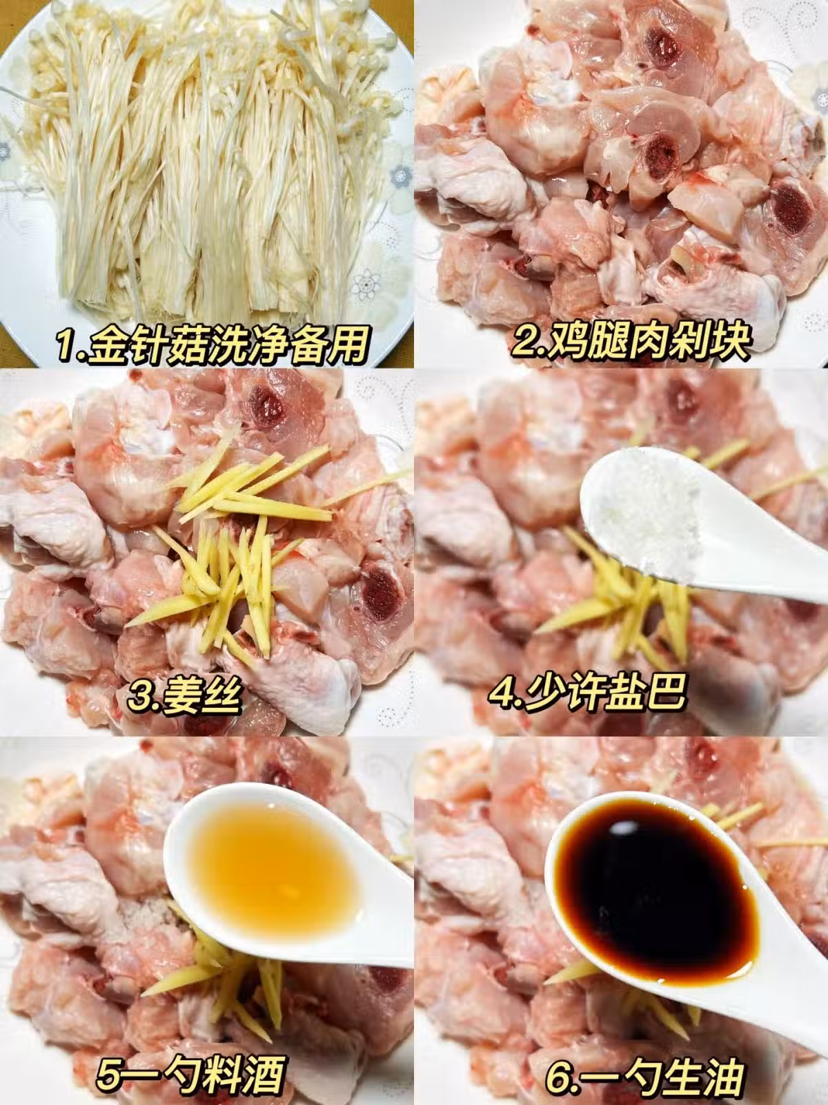 [一R]金針菇洗凈備用,雞腿剁塊腌制:薑絲➕少許鹽巴➕一勺料酒➕一勺生抽➕一勺蚝油➕少許胡椒粉➕一勺澱粉➕少許白糖,抓拌均勻腌制30分鐘