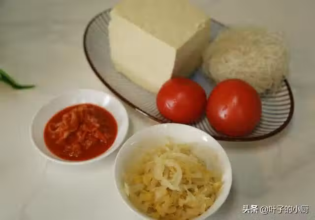 2、粉絲泡軟,豆腐切成小塊,加入熱水和適量鹽,泡一泡。