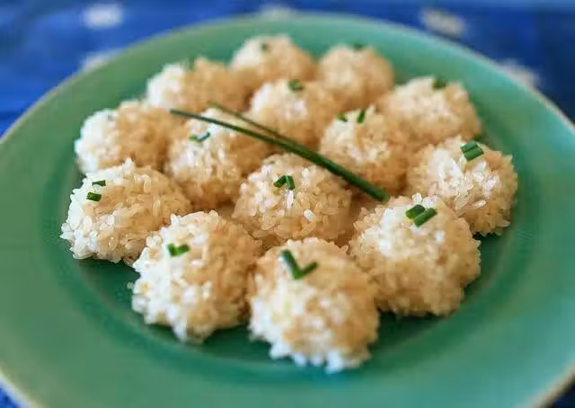 8.豆腐丸子均勻滾上糯米。