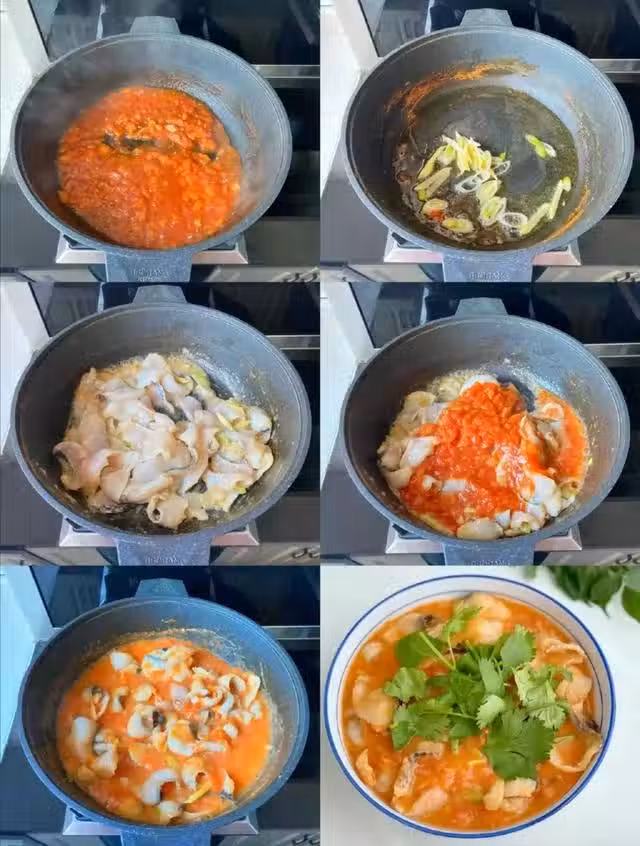 6把炒好的番茄醬汁倒入鍋里,和黑魚片拌勻,加入少許熱水,一起翻炒1分鐘左右,黑魚片熟了即可關火。
