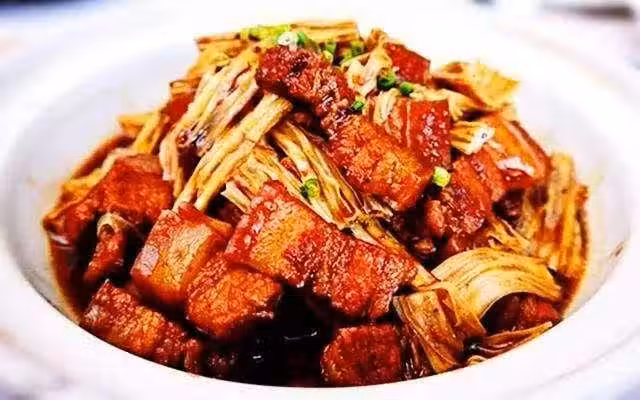 5、開大火,加小把冰糖,收些汁,再倒入腐竹,燒至腐竹入味,即可.