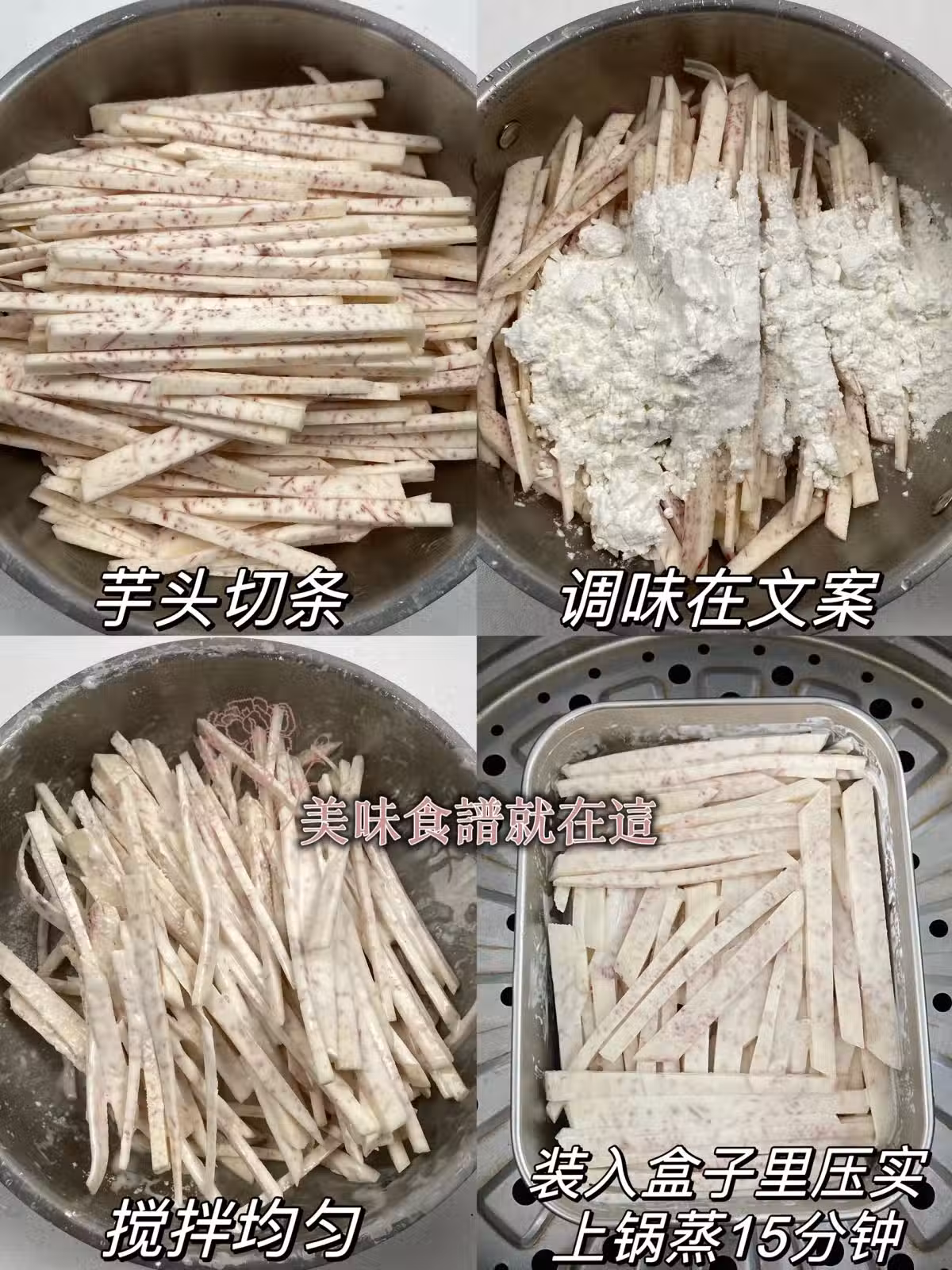 1️⃣芋頭切成絲,加入糯米粉、玉米澱粉、適量鹽和水,抓拌至無粉狀