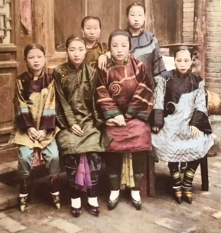 這是晚清時一大戶人家的4個妾室和丫鬟,她們的年齡也就十幾歲就成為了官宦姥爺的玩物。她們各個裹小腳,真是中國歷史上的陋習。