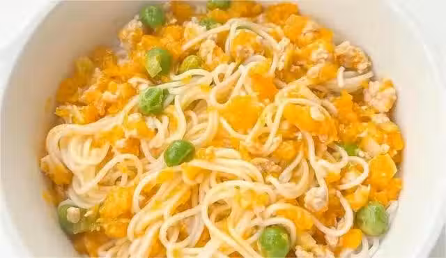 步驟二:鍋中燒油,先把蒜末炒香,再把肉末下鍋炒至變色,翻入南瓜丁、豌豆粒,下鍋炒軟,加點生抽、鹽調味,加適量的開水,下入麵條,煮熟收汁即可。