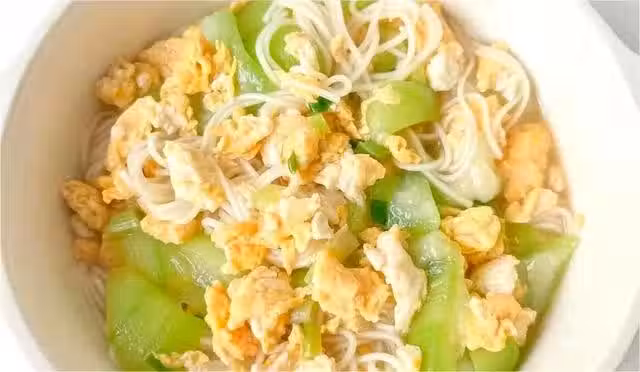 步驟三:鍋中燒油,蛋液下鍋炒散盛出,再把絲瓜塊下鍋炒軟,倒入雞蛋、料汁,煮至濃稠,再把麵條下鍋拌勻即可。
